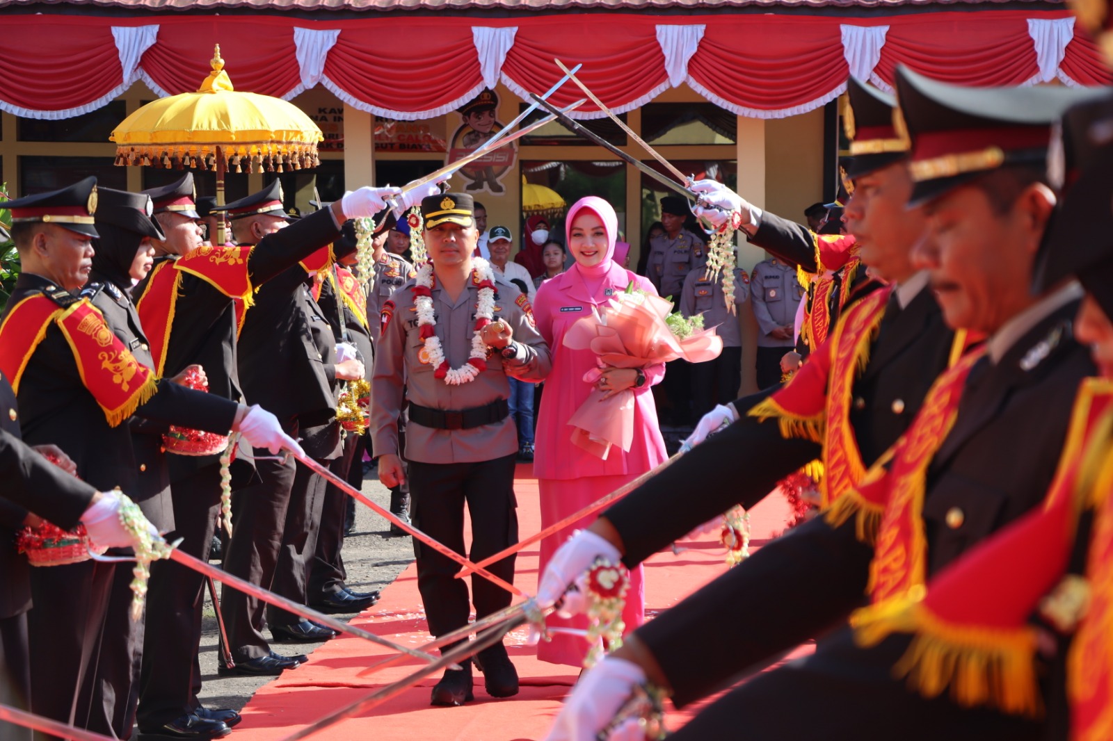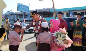 Setibanya di depan gerbang Mapolres, Kapolres Ketapang beserta Ibu Ketua Bhayangkari Cabang Ketapang disambut dengan dua polisi cilik dan menerima pengalungan bunga serta buket bunga dari polisi cilik.