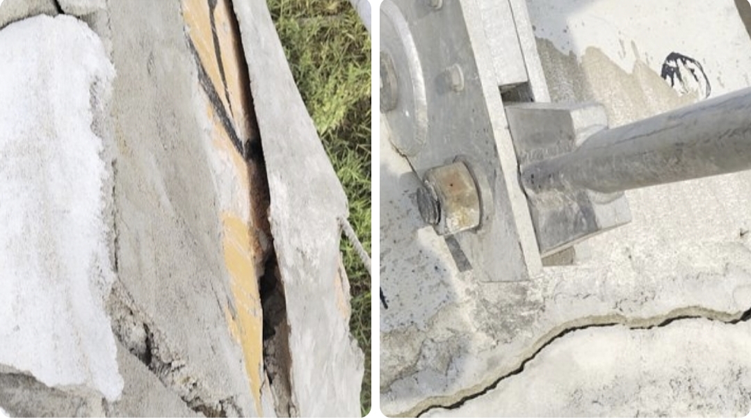 Pantauan di lapangan tampak sejumlah keretakan menganga dan terdapat lobang besar di bagian turunan, diduga pondasi yang tidak kuat menahan beban sehingga timbunan pasir longsor tergerus air saat turun hujan.