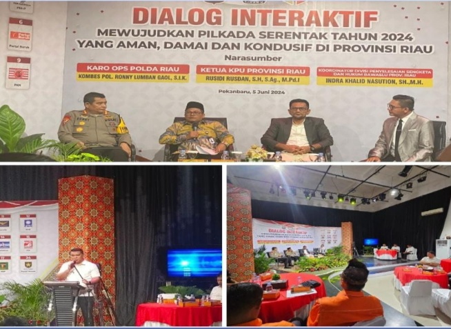 Dialog interaktif ini dihadiri oleh para Narasumber, yakni : Karo Ops Polda Riau, Kombes Pol Ronny Lumbangaol, S.I.K., Ketua KPU Riau, Rusidi Rusdan, S.H., S.Ag., M.Pd.I dan Koordinator Divisi Penyelesaian Sengketa dan Hukum Bawaslu Provinsi Riau, Indra Khalid Nasution, S.H., M.H, perwakilan Pengurus Partai Politik Provinsi Riau, serta Jajaran Pejabat Direktorat Intelkam Polda Riau.