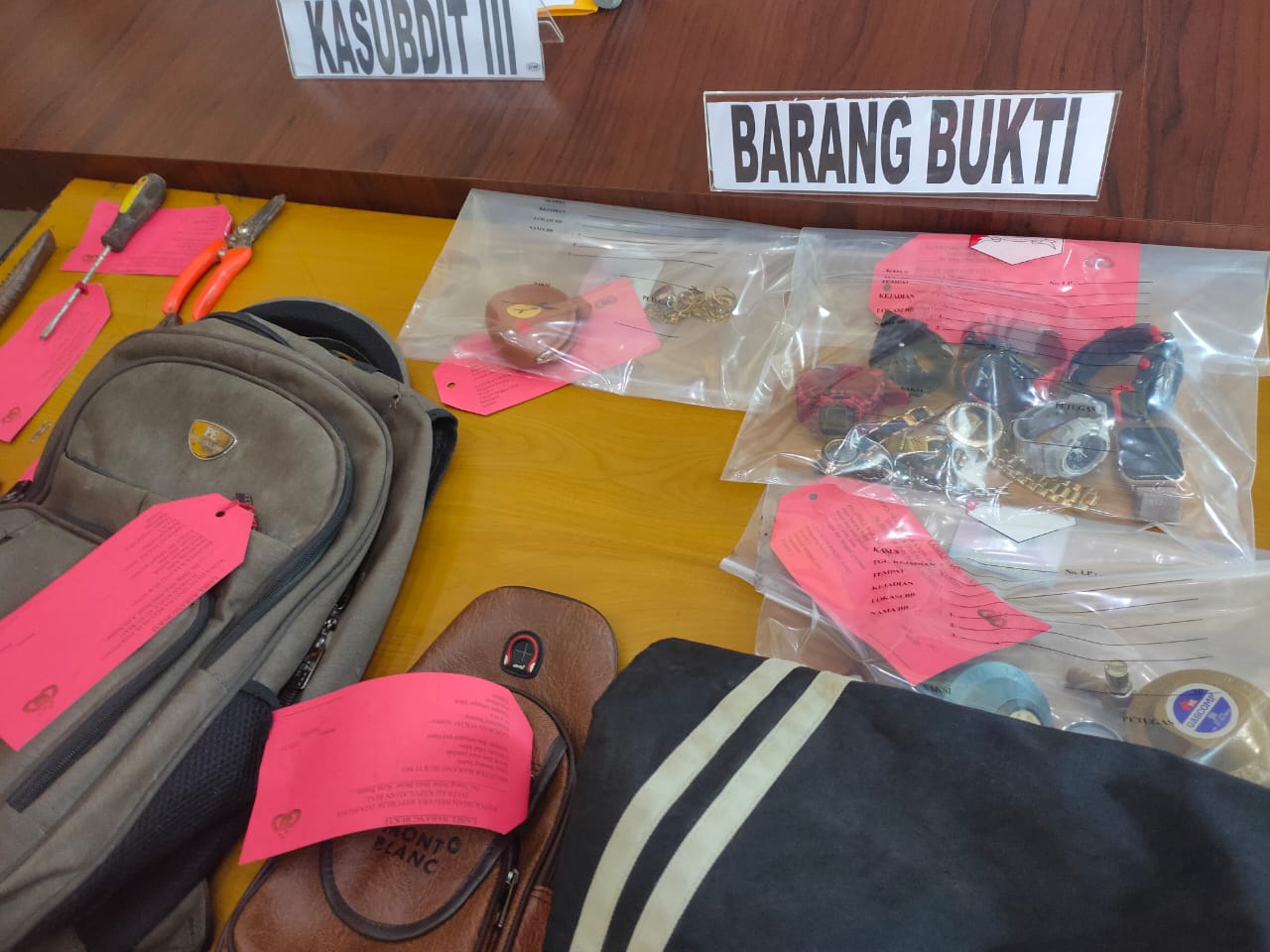 Dijelaskannya, barang bukti yang diamankan adalah 1 unit mobil Toyota Avanza warna Putih, 1 buah tang jepit, 1 buah obeng minus, 1 buah kunci Inggris, 1 buah kunci L, 1 buah Cuting dengan gagang warna Orange, 1 buah Linggis, 2 buah Regulator Tabung Gas, 10 unit Jam Tangan, 4 buah Cincin Perhiasan, 1 buah Gelang Tangan Perhiasan, 4 unit Speaker, 1 buah Tas Slempang warna coklat, 2 buah Tas Ransel, 1 buah Tas Sandang dan seekor Kucing Himalaya warna hitam.