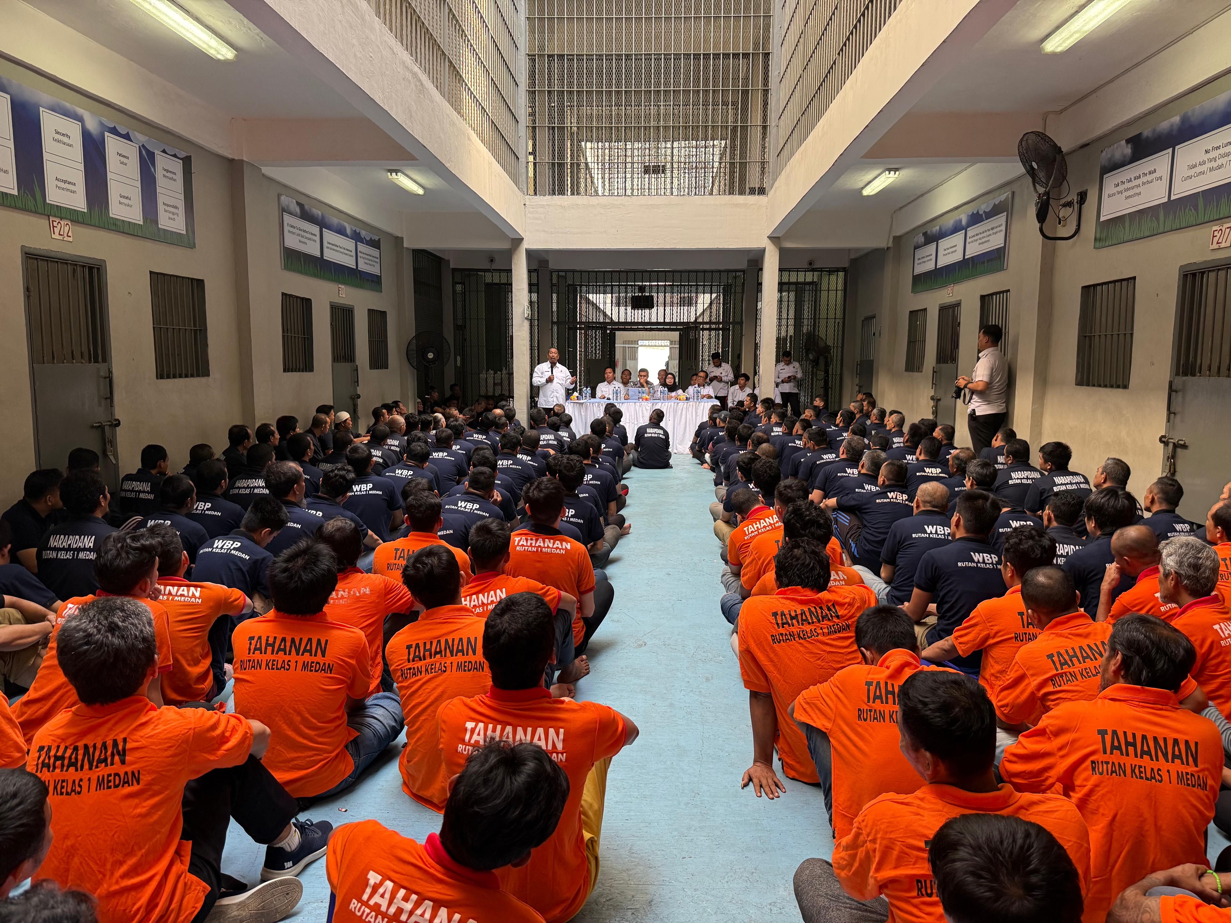 Medan, Sumatera Utara- Beritainvestigasi.com Sebanyak 400 orang warga binaan Rumah Tahanan Negara (Rutan) Kelas I Medan berkumpul dalam blok untuk mengikuti kegiatan Penguatan Hak Asasi Manusia (HAM) yang diselenggarakan oleh Kanwil Kementerian HAM Sumatera Utara, dengan mengusung tema “pemenuhan hak warga binaan adalah Hak Asasi Manusia”. Selasa (26/08).