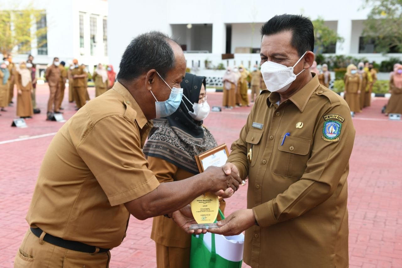 Apel rutin senin pagi tersebut memang disejalankan dengan pelepasan bagi PNS yang memasuki Batas Usia Pensiun (BUP) per tanggal 1 Maret 2022. Total sebanyak 12 orang PNS yang dilepas oleh Gubernur pada saat itu dengan rincian 9 orang dari Dinas Pendidikan, 1 orang dari Dinas Perpustakaan dan Kearsipan, 1 orang dari Dinas Kelautan dan Perikanan dan 1 Orang dari Dinas Kepemudaan dan Olahraga.