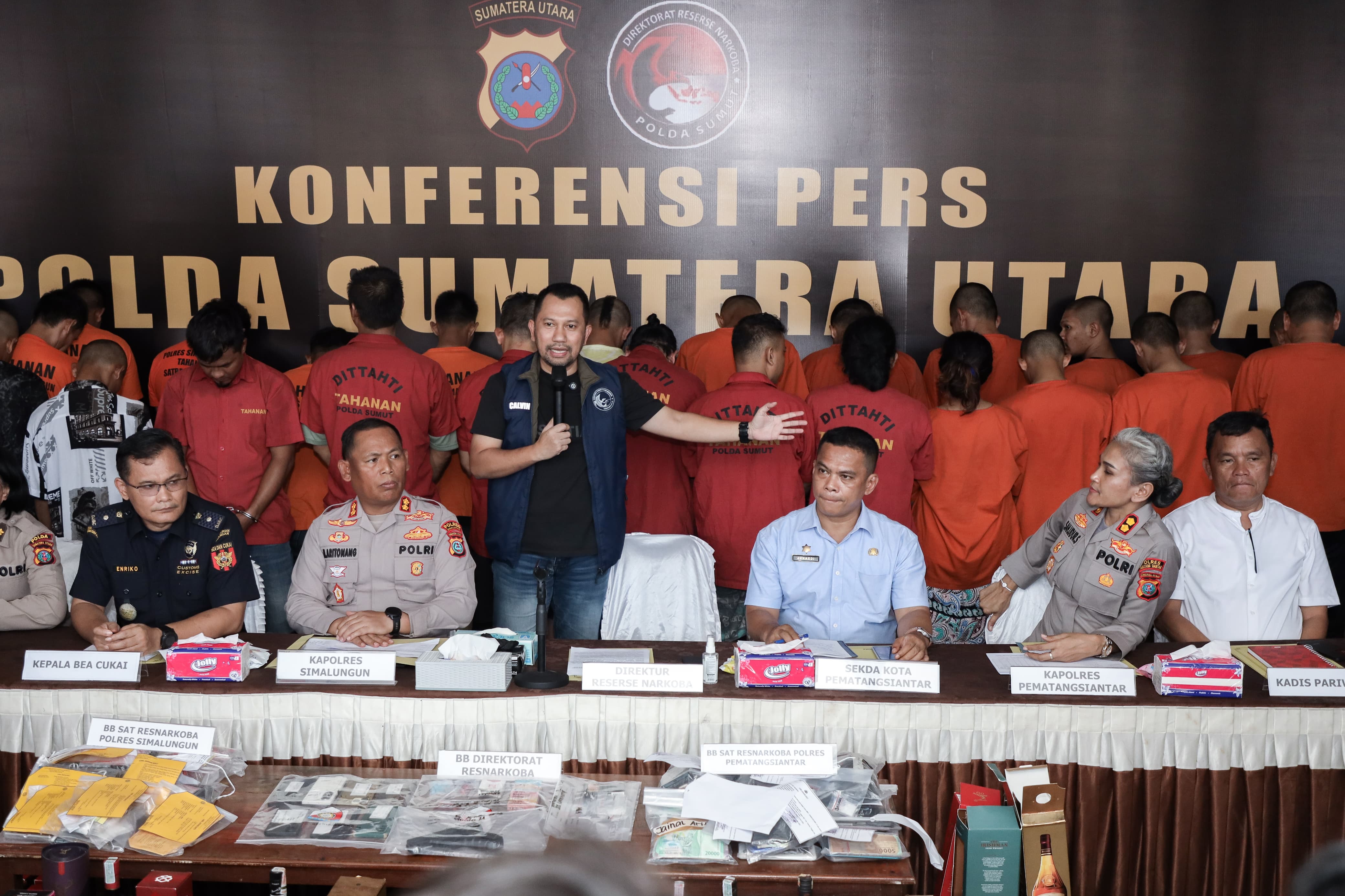 Konferensi pers berlangsung di depan Ruangan Sat Narkoba Polres Pematangsiantar, dipimpin Dirresnarkoba Polda Sumut Kombes Pol Dr Jean Calvijn Simanjuntak. Serta turut dihadiri Kapolres Pematangsiantar AKBP Sah Udur Togi Marito Sitinjak, Kapolres Simalungun AKBP Marganda Aritonang, Kasubbid Penmas Bidang Humas Polda Sumut Kompol Siti Rohani, Kadis Pariwisata Kota Pematangsiantar Muhammad Hammam Sholeh dan Kepala Bea Cukai Pematangsiantar diwakili Enriko.
