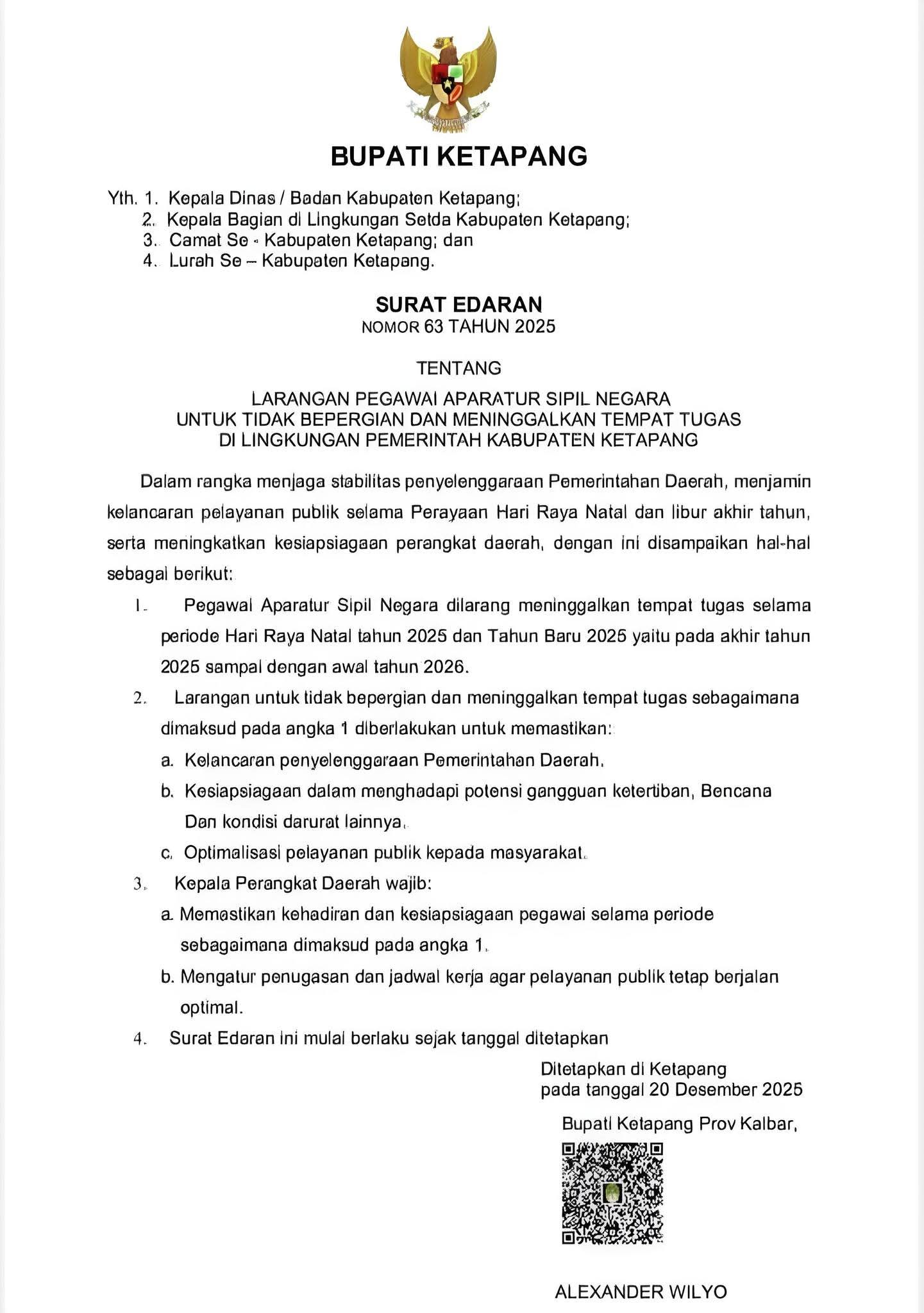 Surat edaran tersebut ditandatangani oleh Bupati Ketapang, Alexander Wilyo, dan menjadi pedoman resmi bagi seluruh jajaran pemerintahan daerah selama periode Natal dan Tahun Baru.