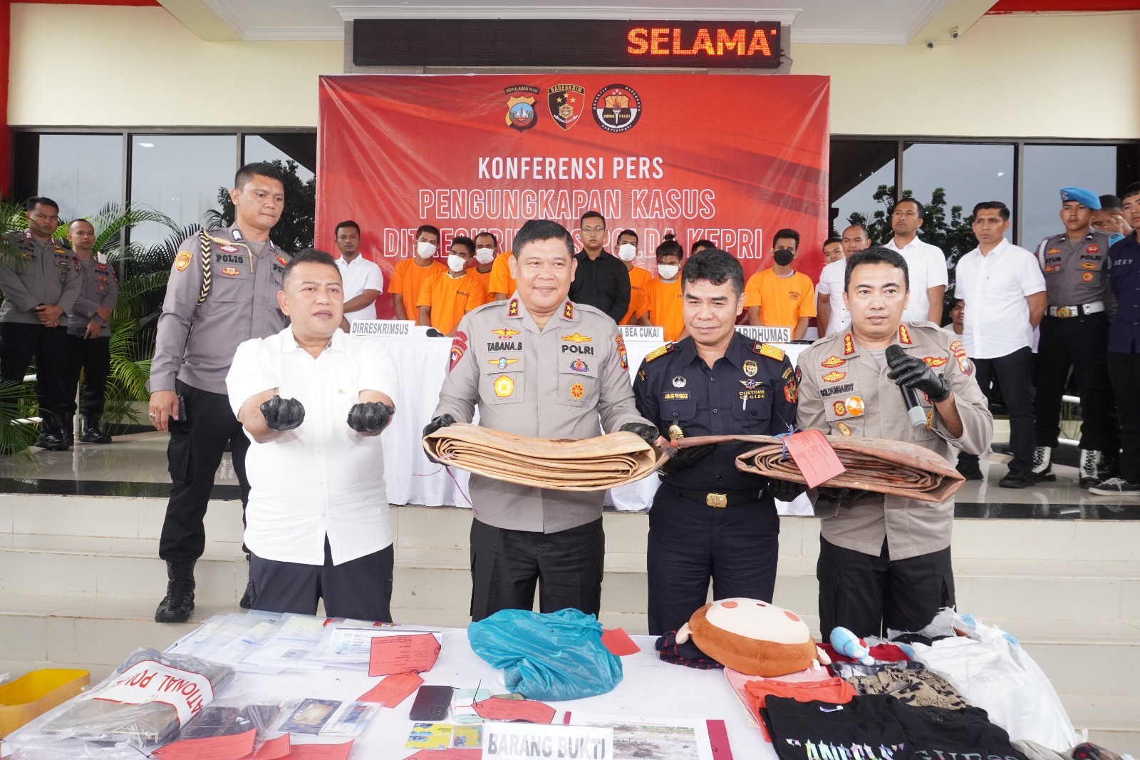 Kegiatan pengungkapan Kasus inipun dihadiri oleh Kepala Bea Cukai Batam, Ambang Priyonggo, S.IP., MPA, Dirreskrimsus Polda Kepri Kombes Pol. Nasriadi, S.H., S.I.K., M.H dan Kabidhumas Polda Kepri Kombes Pol. Harry Goldenhardt S, S.I.K., M.Si.