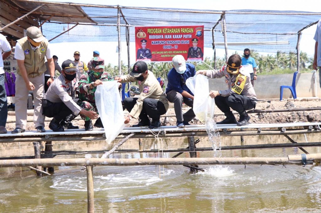 Setelah selesai meninjau beberapa tempat, Kapolres Karimun beserta rombongan melaksanakan kegiatan Penebaran benih Ketahanan pangan berupa benih Ikan Kakap sebanyak 500 ekor dan dilanjutkan panen raya Ketahanan pangan berupa Ubi Kayu (Singkong) sebanyak 1000 Kg.