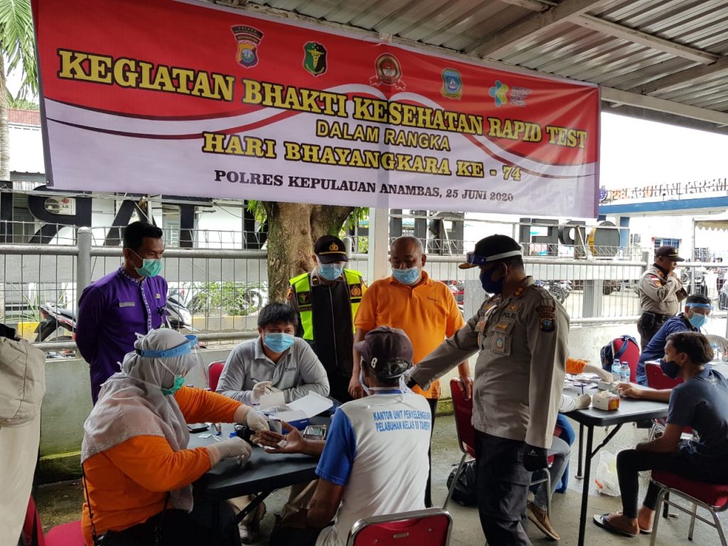Anambas – BeritaInvestigasi.Com. Bakti Kesehatan Rapid Test Polres Kepulauan Anambas dalam Rangka Hari Bhayangkara Ke 74 dengan Tema “Kamtibmas Kondusif Masyarakat Semakin Produktif” bertempat di Ruang tunggu Pelabuhan Tarempa pada hari Kamis (25/06/2020) pukul 08.00 wib