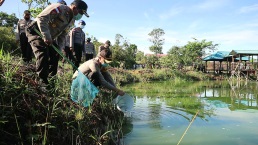 Dalam kegiatan budidaya ikan air tawar di belakang Mapolres Bintan Kapolres Bintan AKBP Bambang Sugihartono, S.I.K. MM menyebar langsung benih ikan ke kolam yang didampingi oleh PJU Polres Bintan.
