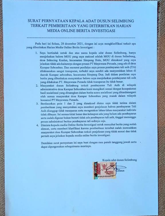 “Namun si Anton menggiring seolah MoU tersebut berlaku di Desa Kampar Sebomban, karena masyarakat Kampar Sebomban punya kesepakatan tersendiri dengan pihak PT. Mayawana Persada yang tertuang di dalam berita acara hasil sosialisasi di setiap dusun di desa Kampar Sebomban. Atas pernyataan tersebut, maka pihak Kadat Selimbong, Kimsun, akan sudah membuat surat pernyataan bahwa pernyataan dia seakan-seakan dibenturkan dengan pihak Desa Kampar Sebomban dan siap menuntut pemulihan nama baik dan menuntut hukum adat kepada pihak Anton atas pernyataan yang salah alamat tersebut, berikut akan dimuatkan di media,” jelasnya.