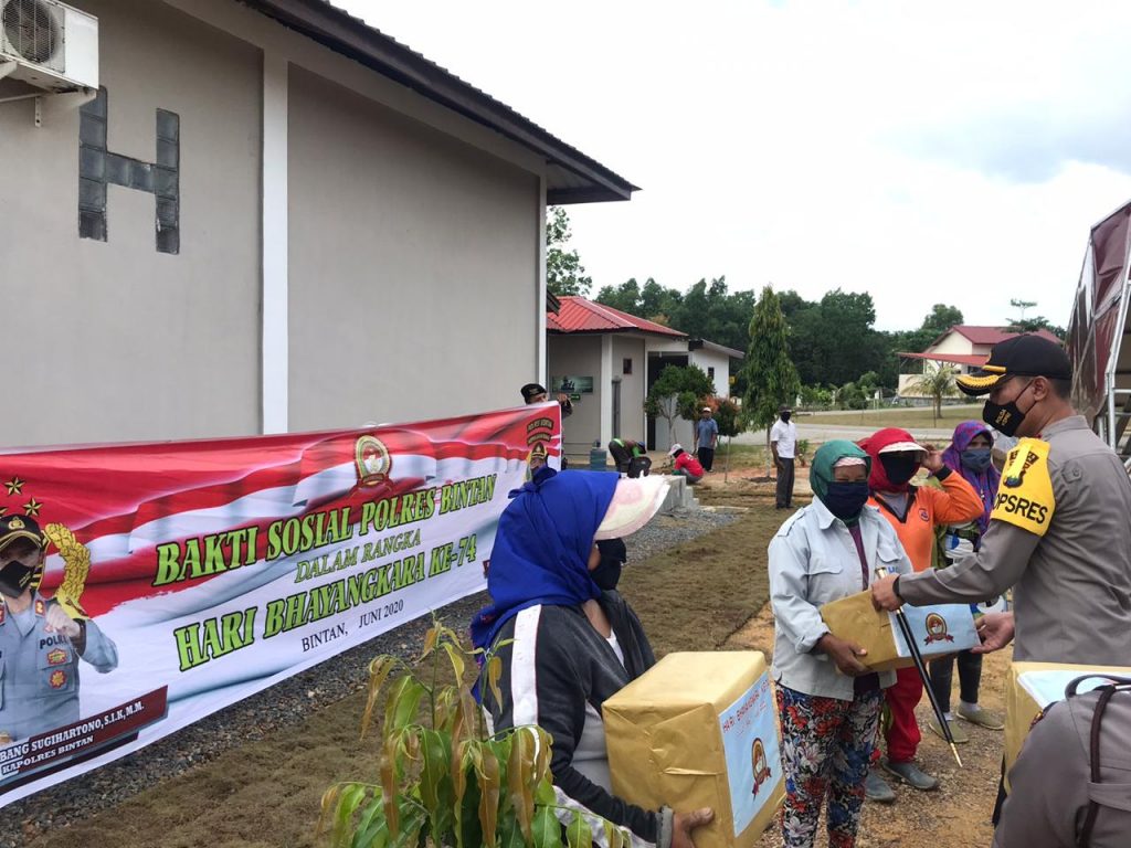 Bhakti sosial serentak digelar dalam rangka memperingati Hari Bhayangkara ke- 74 dengan memberikan bantuan ke masyarakat berupa sembako bertujuan meningkatkan terjalinnya hubungan yang baik antara Polri dengan masyarakat yang bersama-sama menjaga wilayah Kepulauan Riau khususnya Kab. Bintan agar selalu tetap kondusif.