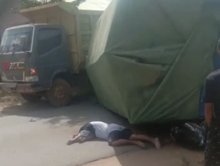 Posisi seorang wanita tertimpa truk terguling di jalan(foto: Humas)