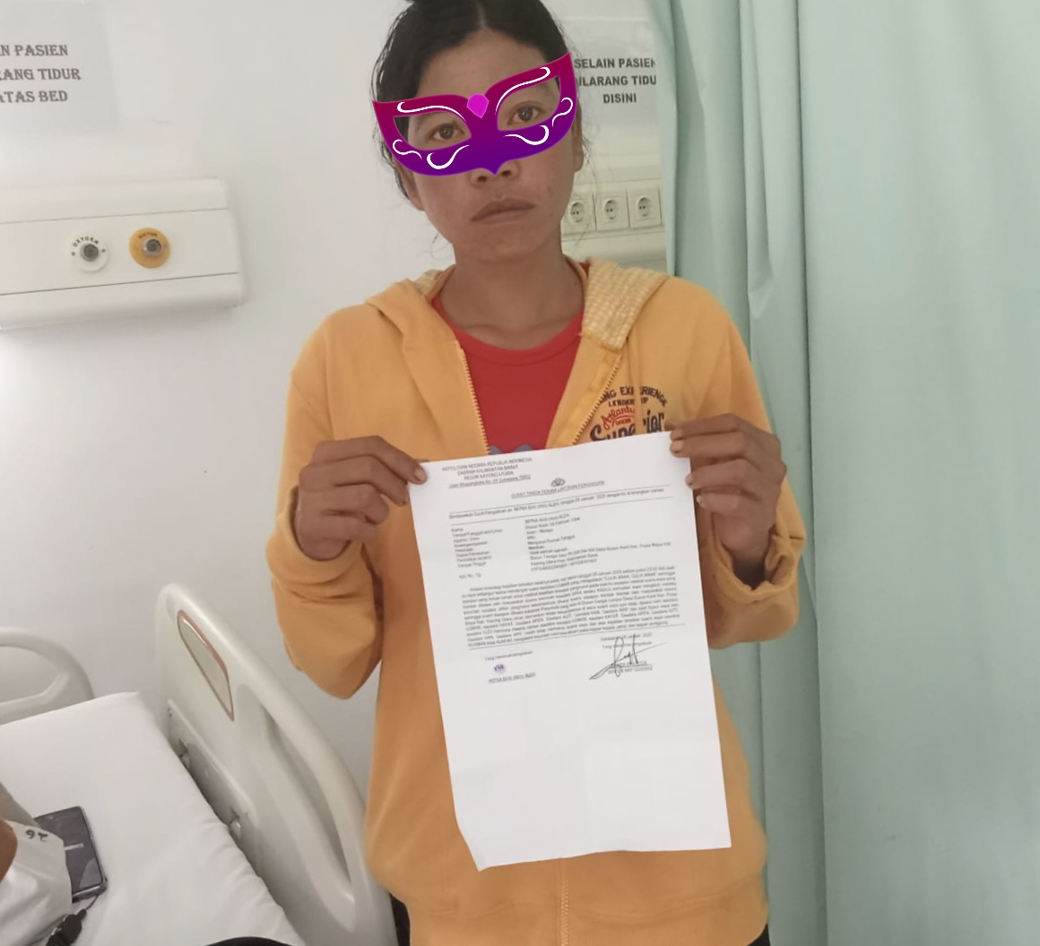 Istri Korban Penganiayaan menunjukan surat tanda terima laporan dari Polres Kayong Utara saat menemani suaminya di RS Sultan Jamaluddin Sukadana