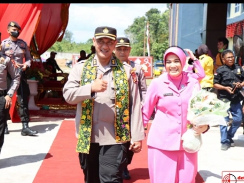 AKBP Eko Wimpiyanto Hardjito, S.I.K didampingi Istri, Nyai Asti Wimpi, menyambut AKBP Pangucap Priyo Soegito, S.I.K, M.H beserta Istri, Nyai Adinda Pangucap di ujung karpet merah.