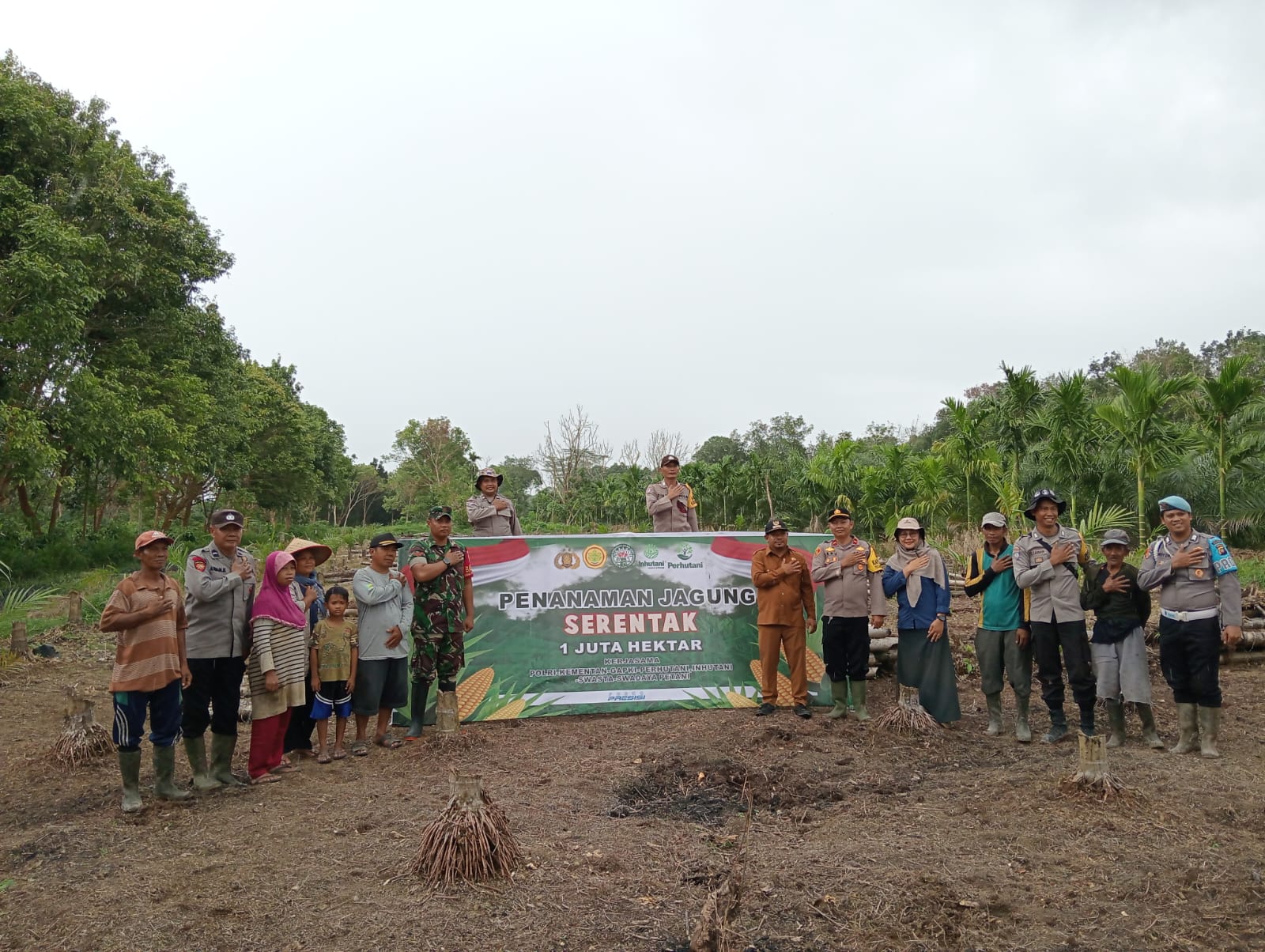 Kayong Utara,Kalbar- Beritainvestigasi.com. Dalam rangka mendukung program Presiden  Prabowo, Polsek Teluk Batang bersama Muspika di Kecamatan Teluk Batang dan warga turut menanam Jagung sejuta hektare secara serentak di seluruh Indonesia. Selasa(21/01/2025).