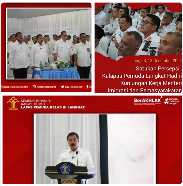 Langkat, Sumatera Utara– Beritainvestigasi.com Dalam rangka menyatukan visi dan misi, Kepala Lembaga Pemasyarakatan (Lapas) Pemuda Kelas III Langkat, Raymon Andika Girsang menghadiri undangan kunjungan kerja Menteri Imigrasi dan Pemasyarakatan, Bapak Agus Andrianto, di Sumatera Utara (Sumut), Rabu (18/12/2024).