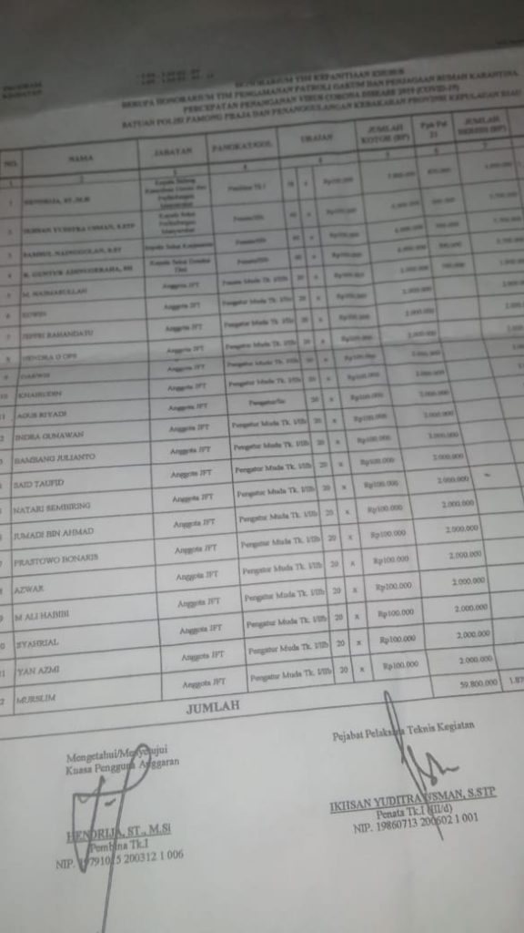 “Kalau 59 juta lebih itu Kegiatannya di jembatan, untuk pengamanan rumah Karantina dan penjagaan rumah sakit rujukan covid-19,itu beda. 59 juta tersebut khusus honor yang dijembatan, karena saya tidak pernah memerintahkan Kegiatan di jembatan tersebut, mana ada saya buat SPT, Silahkan dikonfirmasi ke Kabidnya, Karena dia sendiri yang membuat SPTnya, artinya saya tidak ikut campur dan tidak bertanggung jawab.”jelas Subandi selaku Ketua Bidang Pengamanan dan Penegakan hukum Gugus Tugas Covid-19, Subandi juga menegaskan berdasarkan SK Gubernur Nomor 345 tahun 2020 tentang gugus tugas percepatan penanggulangan Covid-19 provinsi Kepri Gubernur Kepri menetapkan uraian tugas Satpol-PP yakni melaksanakan pengamanan dan penegakkan hukum di daerah secara menyeluruh dan terkoordinasi antara instansi,seperti TNI, Polri dan Kanwil Kemenkumham, Karo Hukum Setda Provinsi Kepri dan Satpol PP Kabupaten se Provinsi Kepulauan Riau.