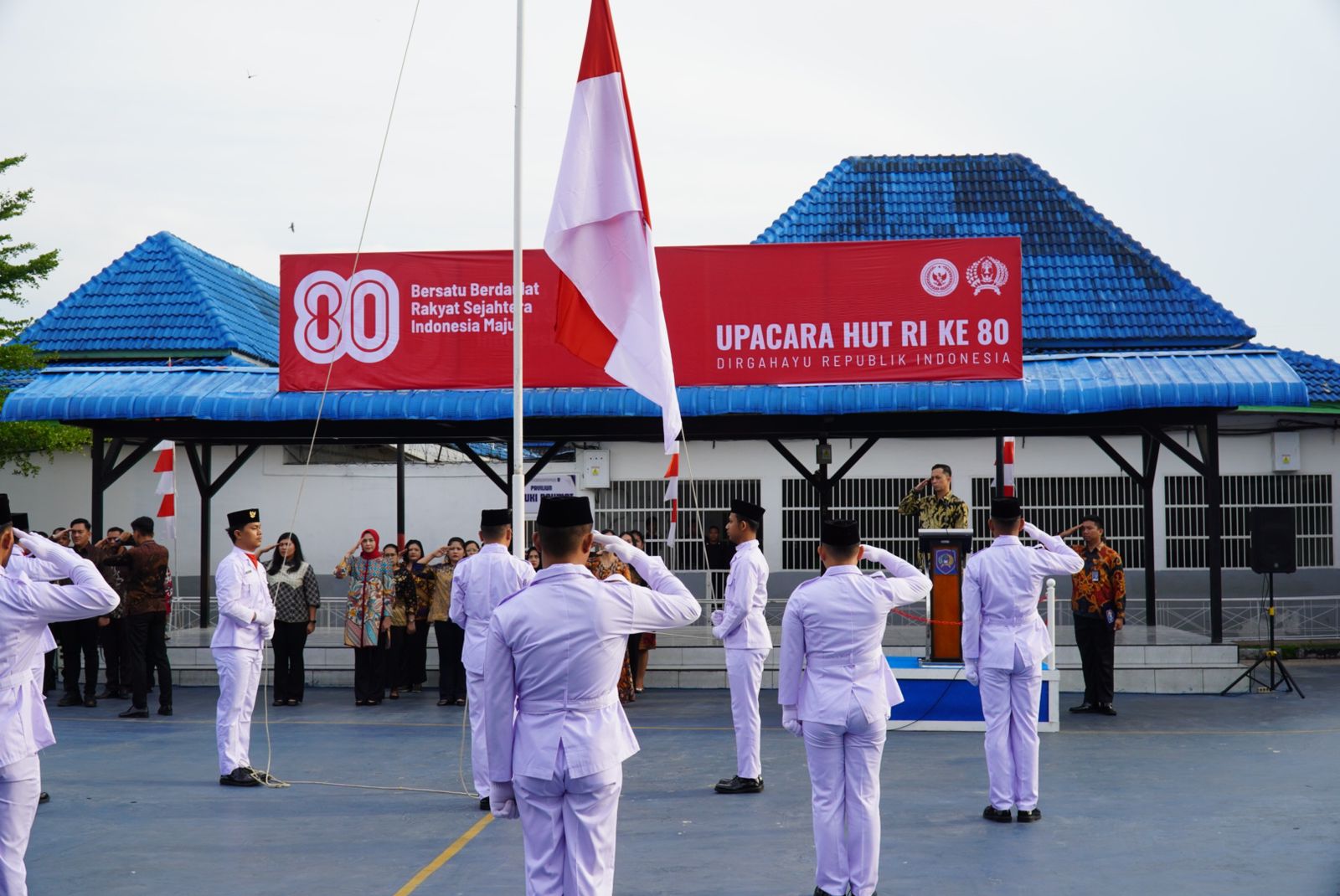 Pengibaran bendera Merah Putih berlangsung dengan penuh khidmat, diiringi lagu Indonesia Raya yang dinyanyikan bersama-sama. Seluruh peserta upacara tampak khusyuk, mencerminkan rasa hormat dan nasionalisme yang tinggi.