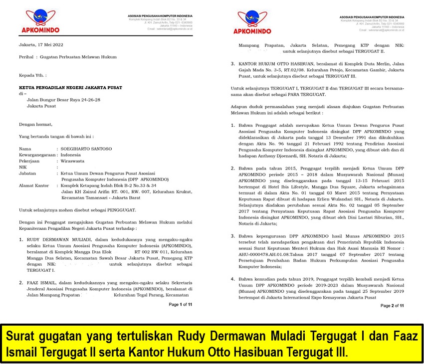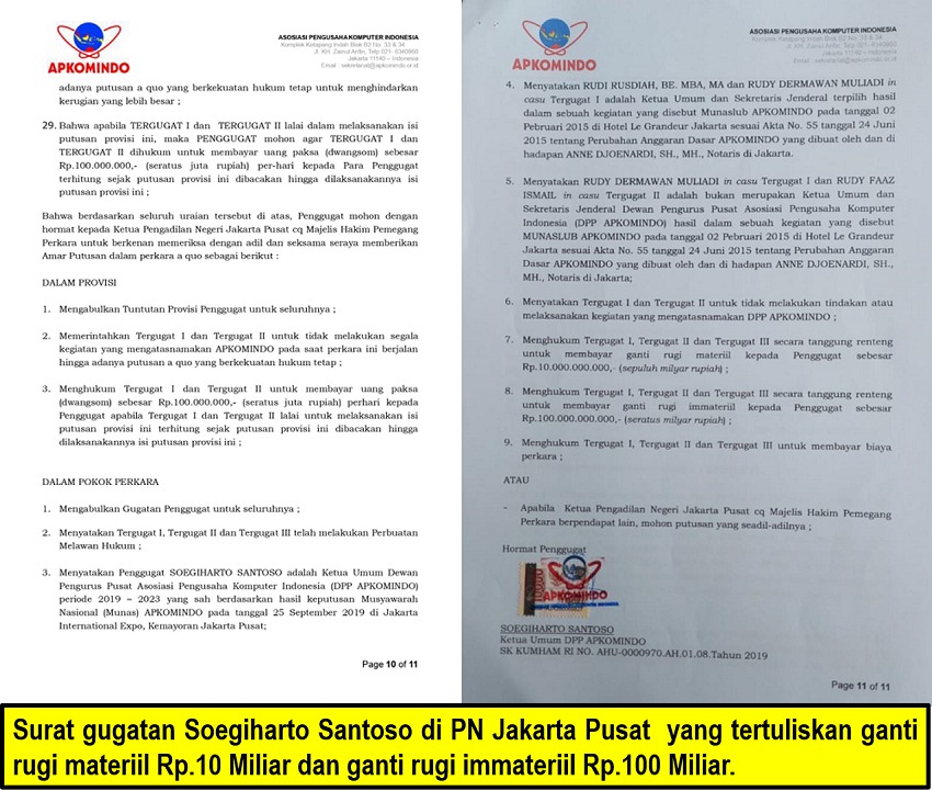 Jakarta – Beritainvestigasi.com. Delapan tahun terus diganggu dengan serentetan perkara hukum, baik pidana maupun perdata, Soegiharto Santoso akhirnya menggugat balik pihak-pihak yang selama ini dianggap merugikan pribadinya maupun Organisasi Asosiasi Pengusaha Komputer Indonesia (Apkomindo) yang dipimpinnya.