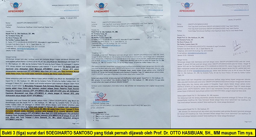 Dikatakan pula, dalam dua perkara berbeda tapi objek yang sama yakni kepengurusan hasil Munaslub Apkomindo tertanggal 02 Februari 2015, terdapat dua keterangan berbeda terkait Ketua Umum Apkomindo terpilih pada Musyawarah Nasional Luar Biasa tahun 2015 versi pihak tergugat.