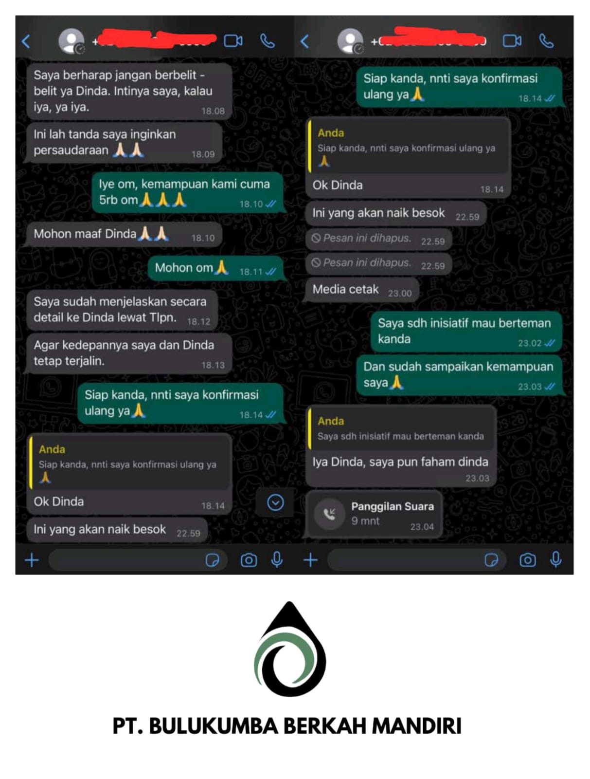 Bukti Chat oknum Wartawan dengan Direktur PT. Bulukumba Berkah Mandiri