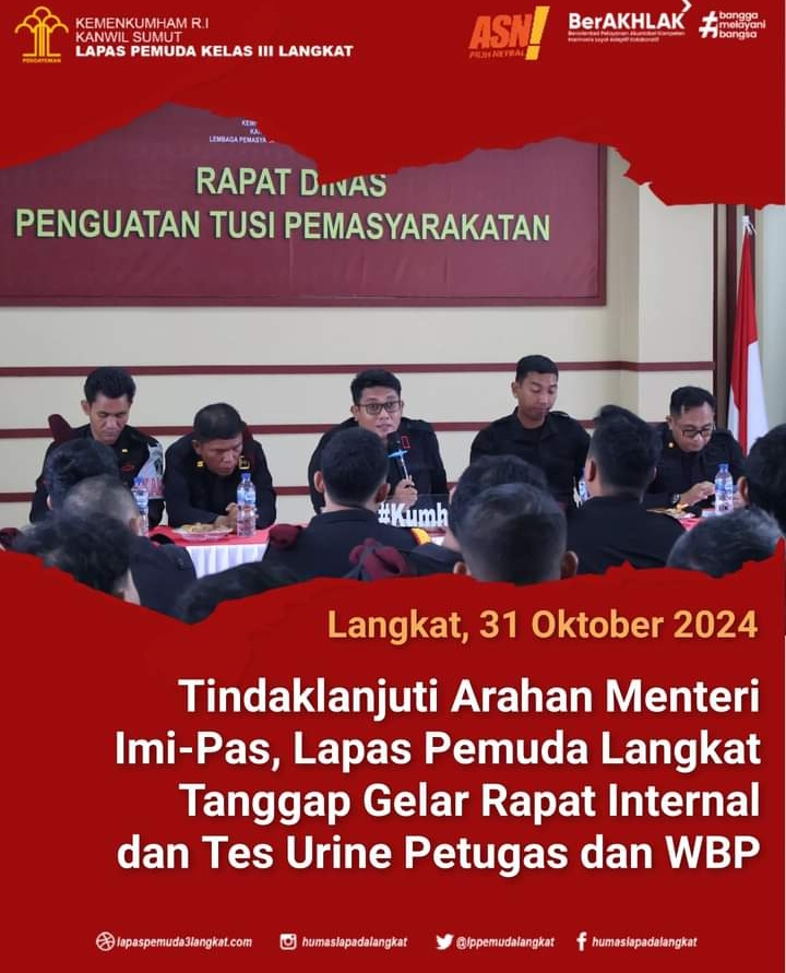 Langkat, Sumatera Utara– Beritainvestigasi.com Bentuk komitmen menjalankan arahan Menteri Imigrasi dan Pemasyarakatan, Agus Andrianto, Kepala Lembaga Pemasyarakatan (Lapas) Pemuda Kelas III Langkat, Raymon Andika Girsang langsung melakukan langkah tanggap menggelar rapat penguatan kepada jajaran Lapas Pemuda Langkat serta Tes Urin Pegawai dan WBP. Kamis (31/10/2024).