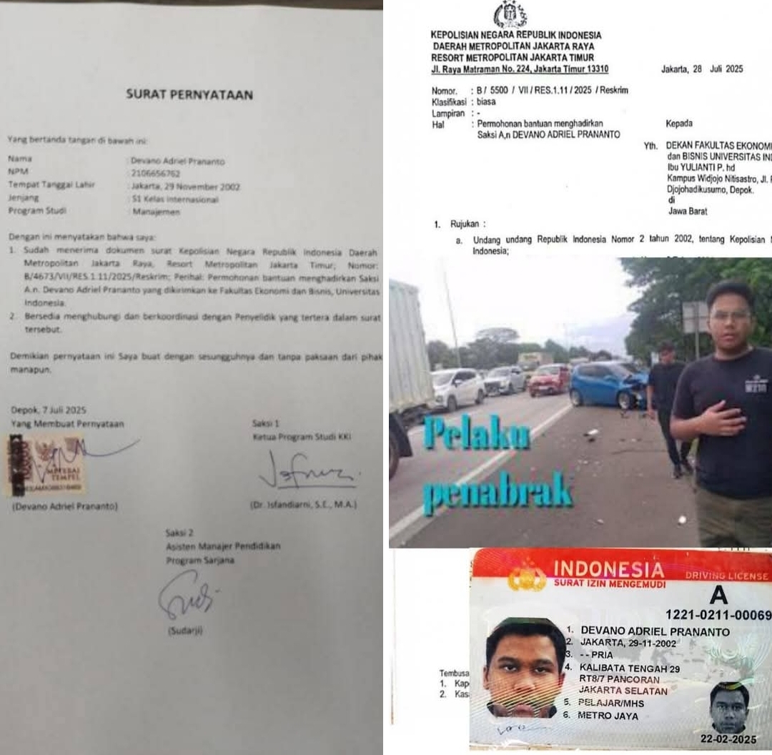 HUKUM dan KRIMINAL Diduga Penipuan, Devano Mahasiswa Fakultas Ekonomi dan Bisnis UI Depok Mangkir dari Undangan RJ Jakarta, Pontianak|September 22, 2025oleh Redaksi Kalbar Pontianak, Kalbar- Beritainvestigasi.com. Peristiwa Laka lantas di Tol Jagorawi Km 48, November