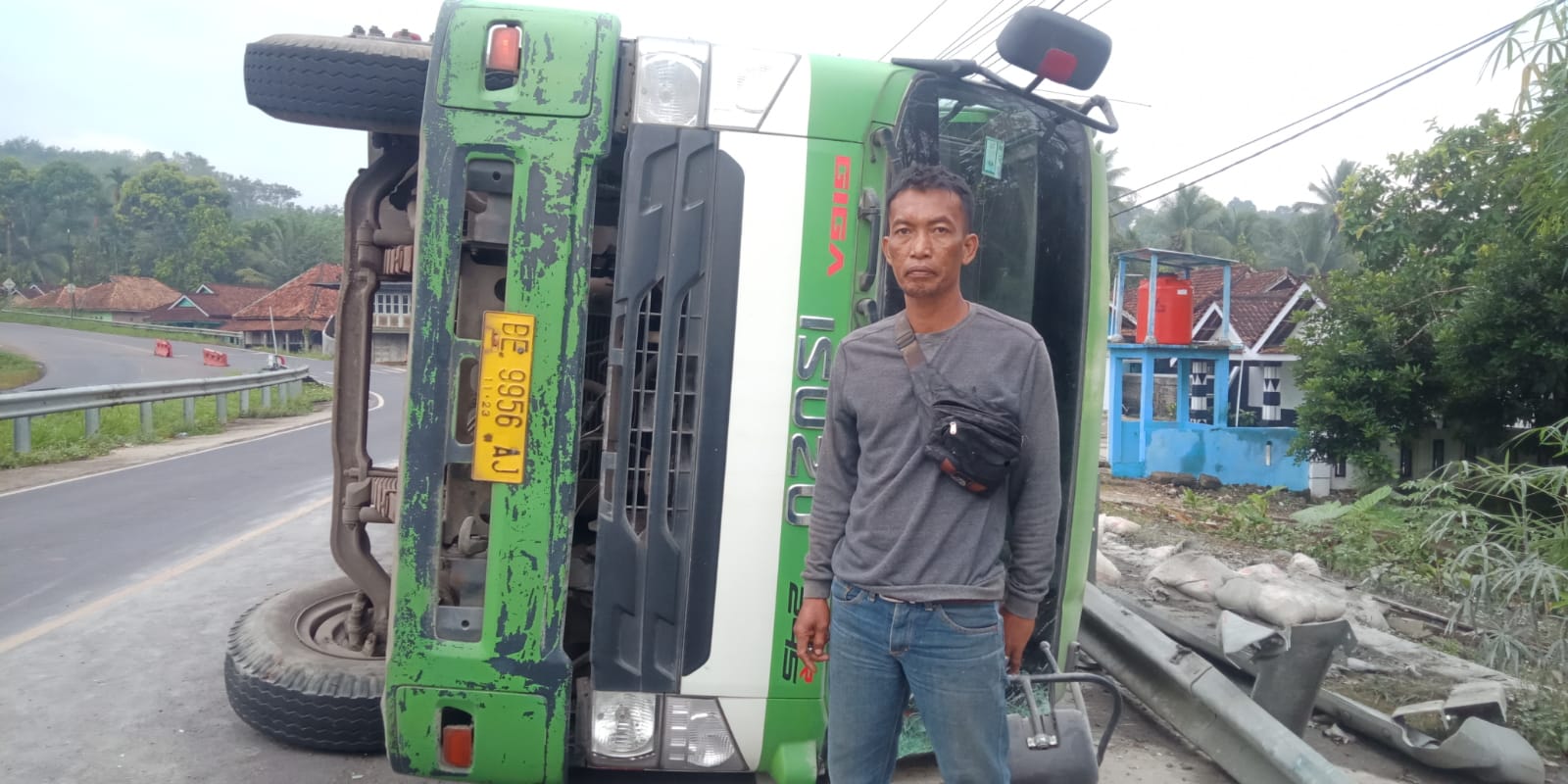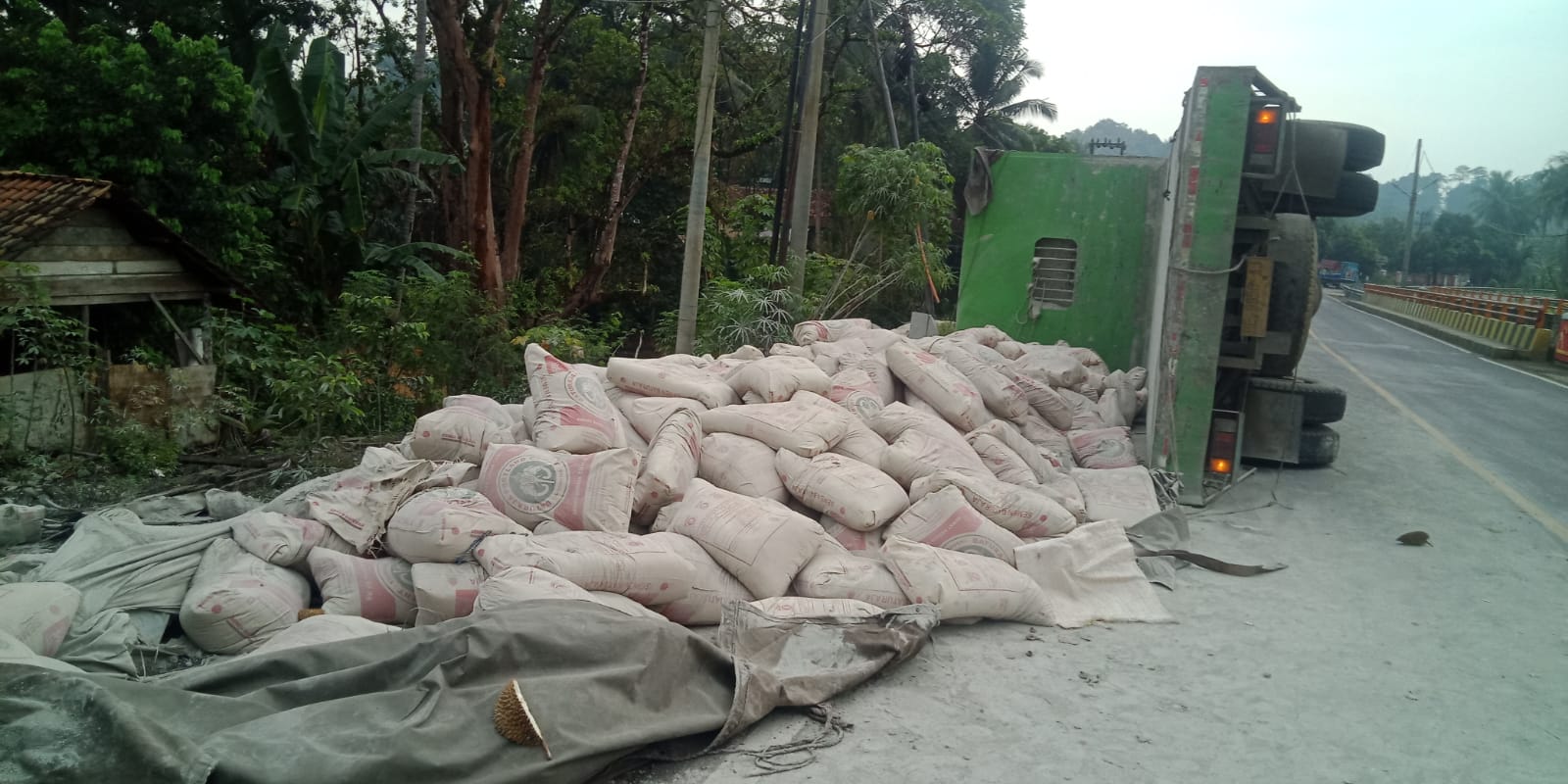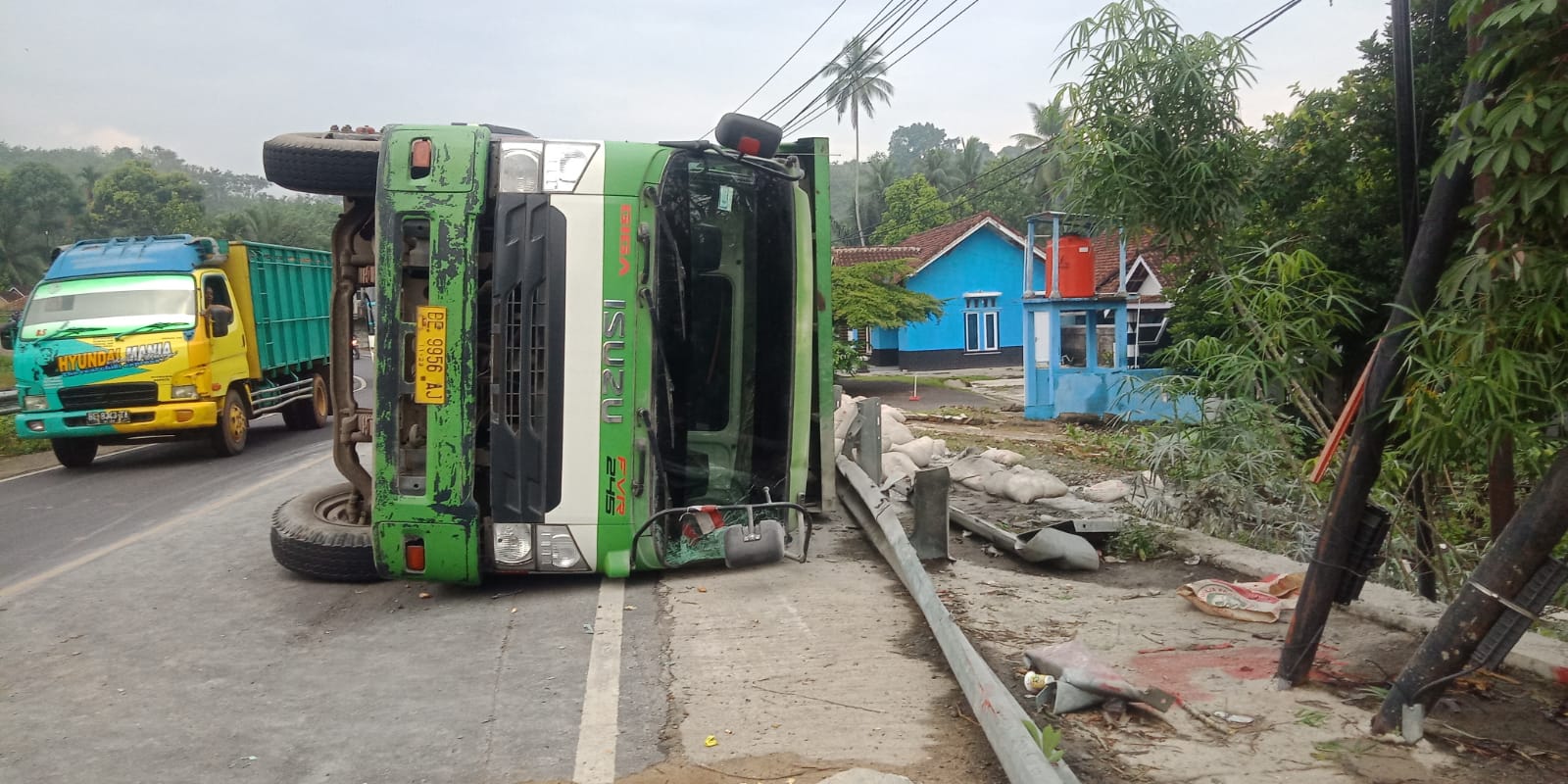 Laka tunggal Truk Hino bermuatan semen dengan Nomor Polisi BE 9956 AJ telah terguling di Kampung Banjarmasin.