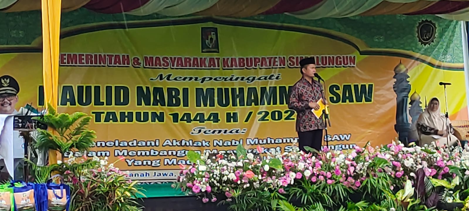 Kali ini tema acara peringatan Maulid Nabi Muhammad SAW Pemerintah Kabupaten Simalungun ” Meneladani Akhlak Nabi Muhammad SAW dalam Membangun Masyarakat Simalungun yang Madani dan Sejahtera ” sebut Ps. Kasubsi Penmas Aiptu Surya Darma dalam keterangannya yang ikut dalam acara tersebut.