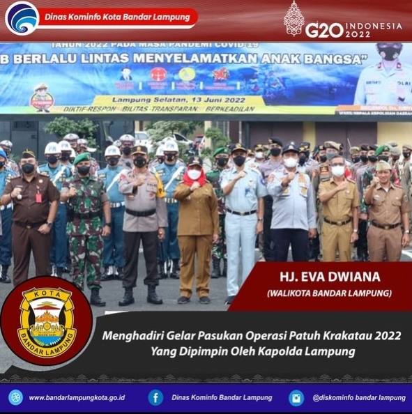 Bandar Lampung – Beritainvestigasi.com. Walikota Bandar Lampung, Hj. Eva Dwiana menghadiri Apel Gelar Pasukan Operasi Patuh Krakatau 2022 yang digelar oleh Polda Lampung di Lapangan Apel Mapolda Baru Lampung, Senin (13/06/2022).