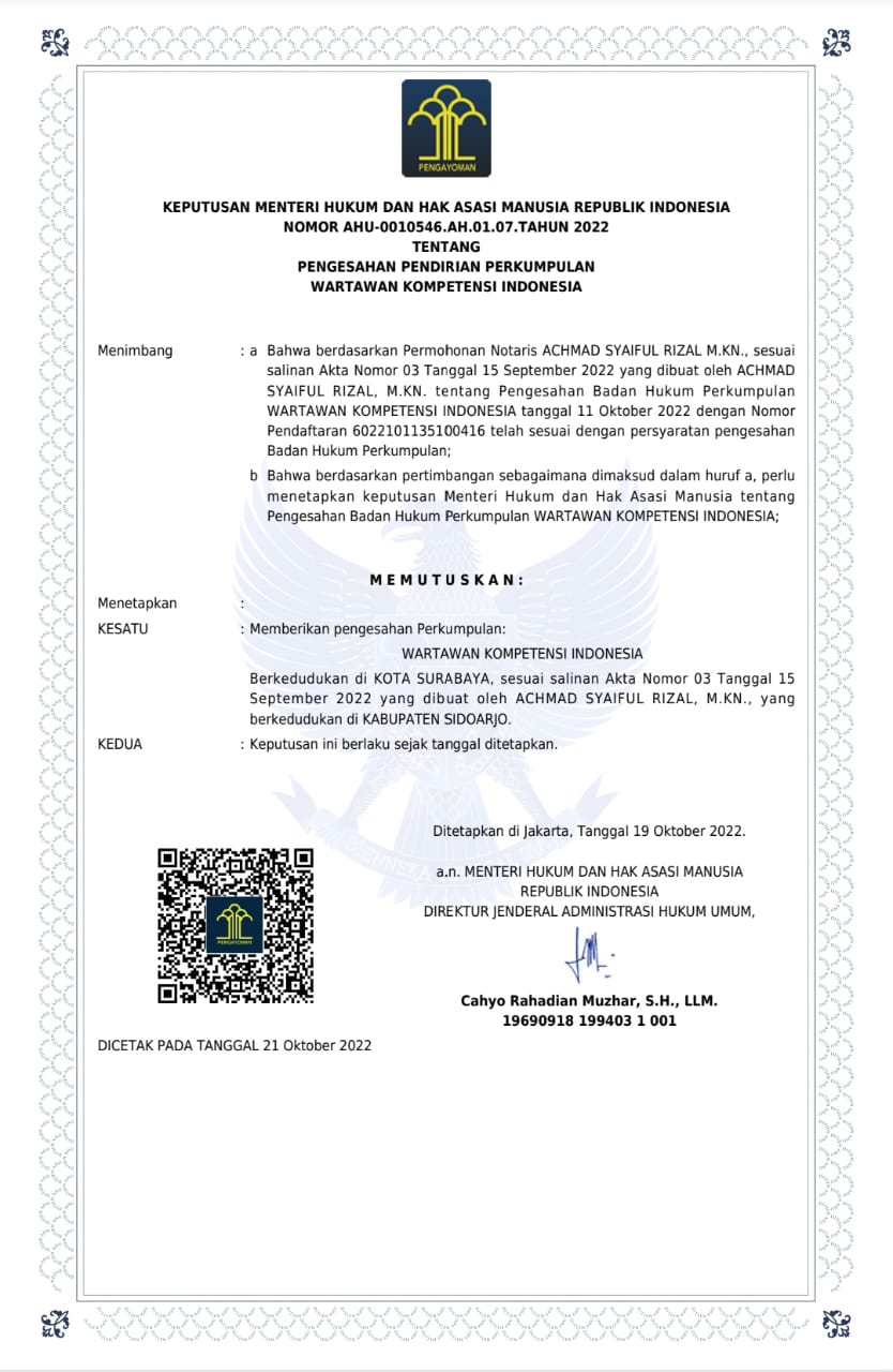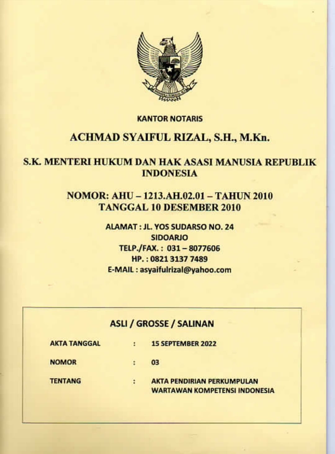 Berpusat di Surabaya, Jawa Timur, Wakomindo resmi mempunyai Badan Hukum Perkumpulan berdasarkan Keputusan Menteri Hukum dan Hak Asasi Manusia Republik Indonesia dengan nomor AHU-0010546.AH.01.07.Tahun 2022 Tentang Pengesahan Pendirian Perkumpulan Wartawan Kompetensi Indonesia tertanggal 19 Oktober 2022.